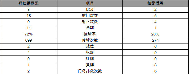 全場比賽,拜仁慕尼黑18次攻門9次射正打入3球,帕德博恩5次攻門4次射正收穫2球。拜仁慕尼黑的控球率高達72%,帕德博恩僅為28%。