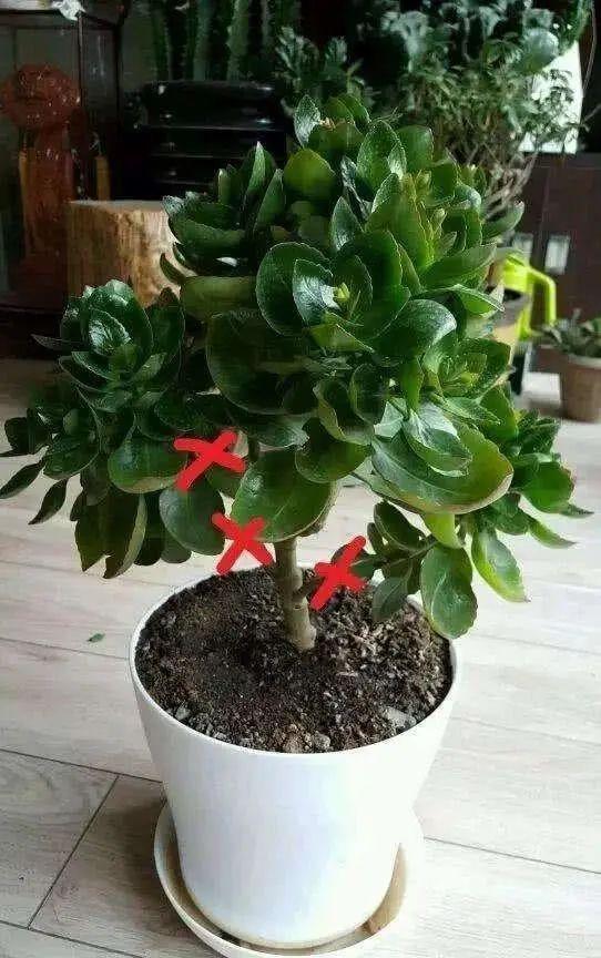 比如下圖中的長壽花有三個主枝條,但是左右兩個枝條太細,我們都要剪去,只留下中間粗壯直立的主枝。