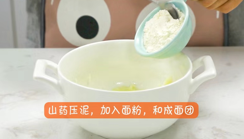 3.山藥壓泥,加入麵粉,和成麵團。