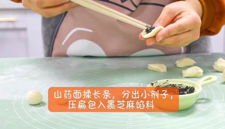 4..山藥面揉長條,分出小劑子,壓扁包入黑芝麻餡料。
