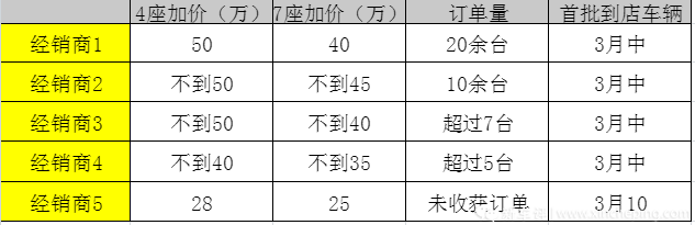 經銷商3和4口吻類似,表示加價不會超過第一家店,優先安排提車順序,支持定制顏色,個人預估銷售報出的訂單量或有水分。訂金3-5萬。