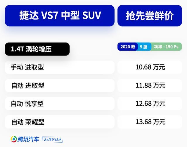 動力方面,捷達VS7全系搭載了1.4TSI渦輪增壓發動機,並與5速手動和愛信6速手自一體式變速器相匹配。其中這款高功率發動機的最大功率為150Ps,峰值扭矩為250Nm,並滿足國六b排放標準。另外,新車全系還標配了前麥弗遜式和後多連桿式的獨立懸掛系統,且均為前驅車型。