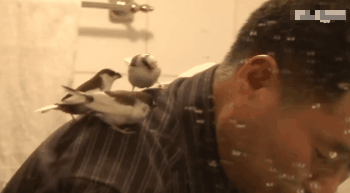 原本想安安靜靜的刷牙休息,但小鳥們卻又會淘氣地落到大叔的肩膀之上。而有時候在打掃衛生,這群鳥寶寶又會不厭其煩地落到大叔的後背,就如同高高在上的監工,指揮著大叔的移動。