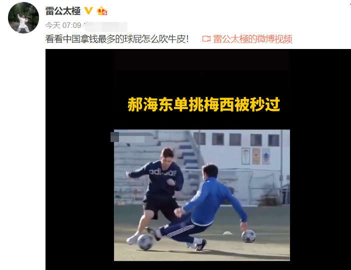 雷雷轉發的這則視頻是在2016年梅西應邀參加國內某檔節目時拍攝的,當時他和郝海東共同完成了很多項目,其中之一就是單挑。太極雷雷截取了其中一個片段,那就是郝海東被梅西輕鬆抹過的視頻,雷雷嘲諷道:“看看中國拿錢最多的球屁怎麼吹牛皮!”這句話毫無疑問是在批評郝海東炫富+吹牛。