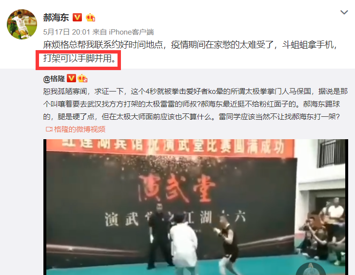 當然,郝海東自己也比較喜歡吹牛放話,但太極雷雷用斷章取義的方式,來批評郝海東實在令人有些不齒。此前,郝海東曾在社交媒體上公開向雷雷宣戰,表示:“麻煩格總幫我聯繫約好時間地點,疫情期間在家憋的太難受了,鬥蛆蛆拿手機,打架可以手腳並用。”不過雷雷卻用一句話頂了回去:“你說打就打?做夢!”
