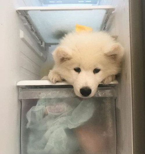 看看這只薩摩,因為還未成年體型不大就輕而易舉鑽進冰箱裡去了,別說薩摩和冰櫃還挺合適,像個北極熊似的。