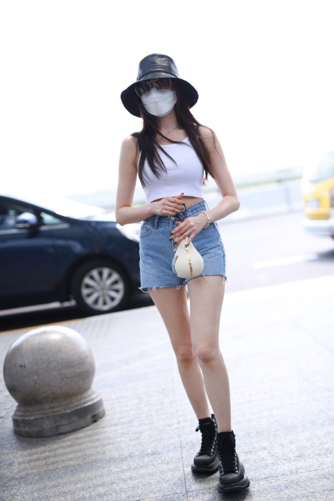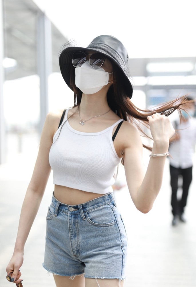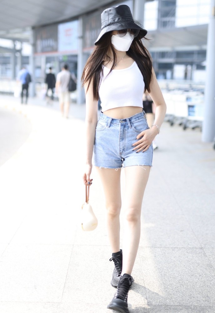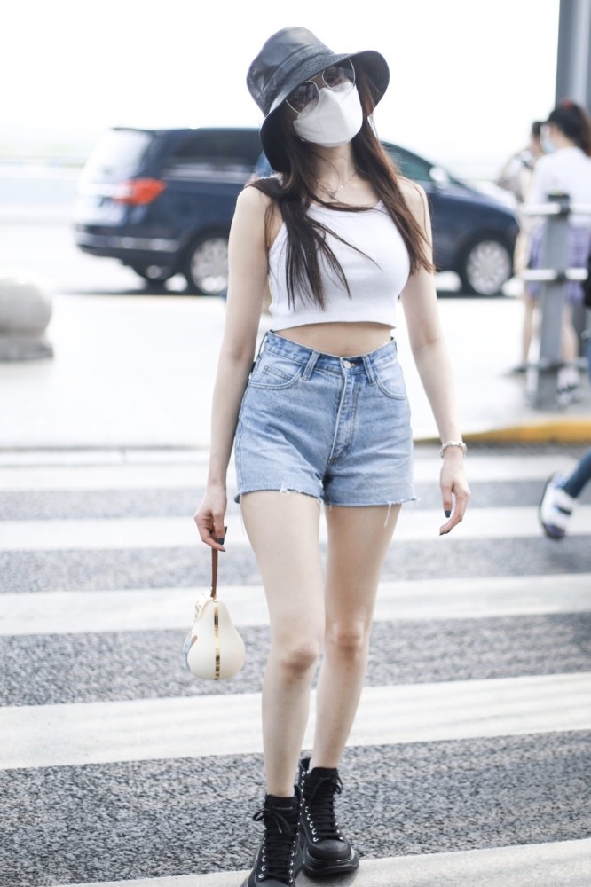 超短的白色吊帶背心下面,張天愛搭配了一條淺藍色的超短牛仔褲,牛仔褲不僅是超短的款式,還是高腰的款式,這兩種相結合就已經非常的修飾身材了,高腰的褲子把張天愛的腰線拉的很高,這樣一來整個人的身材比例就顯得很完美,超短褲的長度也能把張天愛的腿顯得特別修長,不過這種褲子雖然美,但同樣也只適合身材好的女生。