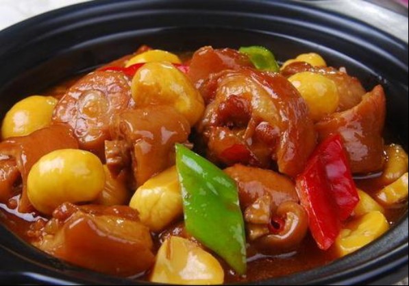 4、臨出菜時,把豬尾和板栗一同入鍋,加紅美人椒節燒至汁濃時,淋香油並撒些蔥花,即成。