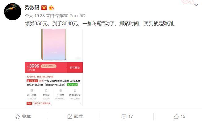 最新的消息在顯示在PDD之上一加8的價格已經被幹到3649元,也就是降了350元。此前該機的起步價為3999元,從一加8系列正式開售到現在正好是40天的時間。看似不是官方的降價,但這個降價比官方降價引起的影響還要大。因為第三方一降價對於正常銷售渠道會起到打擊的作用,對於潛在的消費者來講會影響他們的購買慾望,因為大眾消費心理看到這種現象肯定會要觀望的。