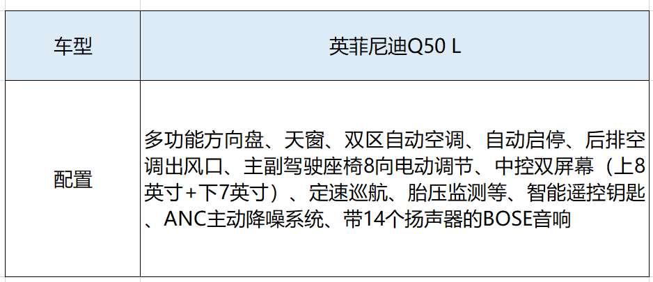 作為英菲尼迪旗下比較熱門的中型車,Q50 L已經上市許久,官方指導價26.48-38.98萬元,目前新車最高可優惠6.3萬元,現報價為22.48-33.48萬元。外觀方面,新車採用家族式設計風格,整體的流線非常舒暢,提供舒適版、悅享版、運動版、豪華版、豪華運動版車型,供各種類型消費者選擇。
