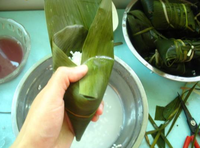 第二:將粽葉清水泡一泡,糯米提前泡好,將粽葉打成三角形,將糯米放入粽葉,用繩子將粽子包緊一些。